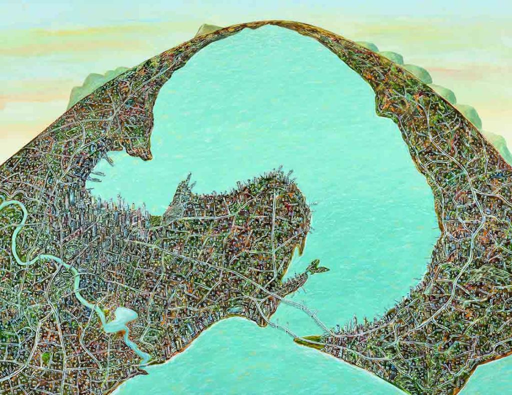 Painting, Geelong capriccio (if Geelong were settled instead of Melbourne) by Jan Senbergs, acrylic on canvas. © The artist. Courtesy the artist and Niagara Galleries, Melbourne.