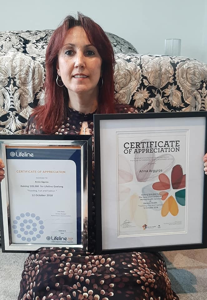 October is Mental Health Month. Anna Argyros shares her experience. “3 years ago, I plucked up enough courage to organize my 1st fundraiser for mental illness, which is very close to my heart, in my hometown Geelong, with the amazing help and support from family, friends, businesses, customers and just people in general. In just 4 months, we raised the astounding amount of $42,000-00