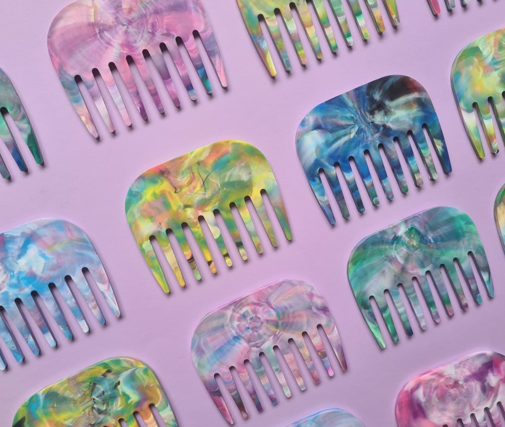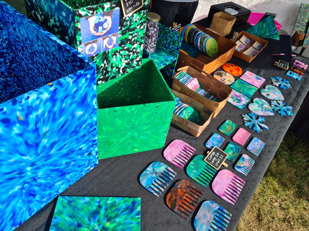 It was their eye-catching stall at the Geelong Circular Living Show that first grabbed my attention. Boxes, earrings, USB’s, key-rings, clipboards, pens, combs (the list goes on), seemingly forged in an explosion of colour! After a friendly chat, I was not only inspired by learning how they make each design, but also by the story that brought about their Ballarat-based business. Adz recounts the journey: