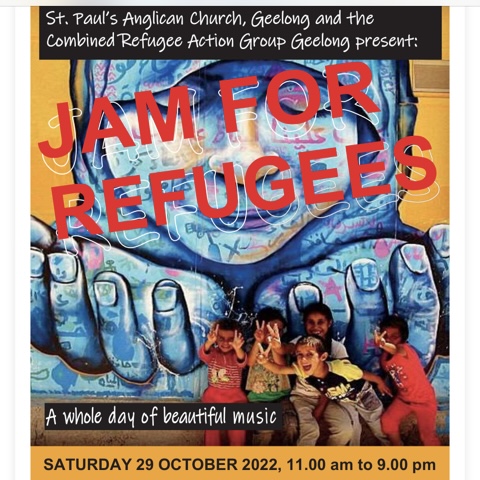 “Jam for Refugees” in Geelong is a 10-hour concert, to benefit refugees in our area, this Saturday Oct 29th at St Paul’s in Latrobe Terrace from 11am-9pm. Entrance is by donation, and people are encouraged to “come when you can, leave when you must.” “Jam for Refugees” originated in Canberra where it ran for three successive years.