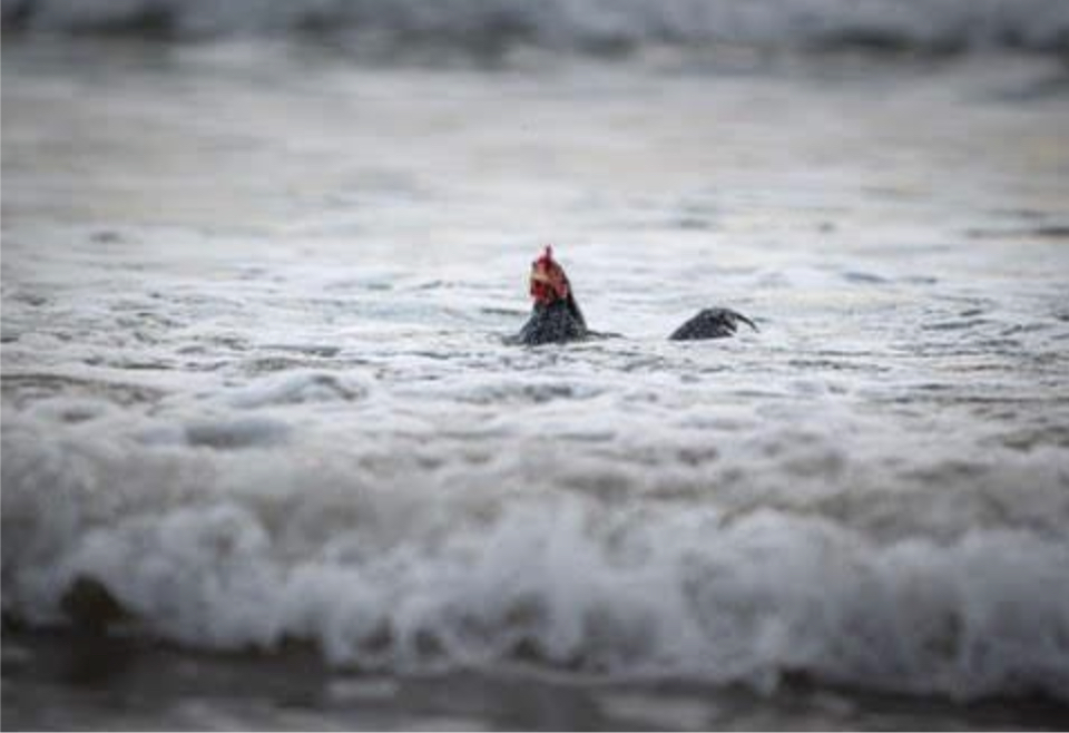 “Recently, at the usual time of 6.30am Mrs Chook was under my arm and we were tracking our way to the surf, it was a fair way out. There was very little sunrise that morning, it came and went quickly. The sky became darker and suddenly down came the torrential rain. My decision was return home. My chook has a calm personality, never a problem but this particular morning she started crying at a low level, the intensity increased again and again, until it was very high-pitched. She definitely had full emotional needs of surfing in the ocean regardless of the potent weather. So, back to the car, collecting towels and a coat, and with a calmer chook under my arm we briskly headed straight out to the ocean.